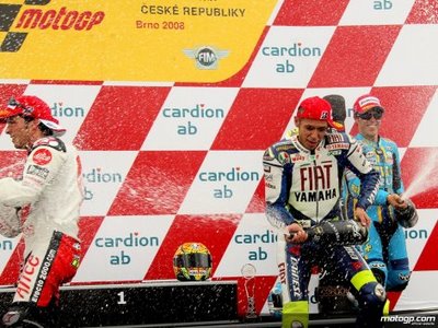 Stoner started on pole, with Rossi right next to him. It was pretty clear when they left the grid that it was going to be another one of those races where Stoner just disappeared into the sunset after a few laps. Which is basically what did happen. Rossi also broke away from the pack, but Stoner was turning a comfortable lead, lap after lap. Until, about half way through the race, when Stoner low-sided coming through a corner, paving the way for Rossi’s spot on the top of the podium. Speaking of the podium, Rossi was sharing it with some unlikely suspects. Toni Elias came in second riding the Alice Ducati. What? Caprirossi taking third wouldn’t be too much of a surprise, being that he is such a veteran, but lets face it, the Suzuki GP bikes are total crap. Just ask Hopkins, who struggled with their factory bikes for the last three seasons. Speaking of Hopkins, he had a great start, coming back from a major knee surgery. He was in third position for a good portion of the race, but ultimately ended up not even finishing in the top 10. One has to imagine that dragging your freshly repaired knee on the ground at 150 mph, will wear you down after an hour or so. He did make it clear that he should be able to produce some results, once full health is regained. Pedrosa raced like crap and blamed it on Michellin. If empirical data is any indication, there is most likely some truth to his complaint. The Michellin shod bikes have failed to perform, all season long.