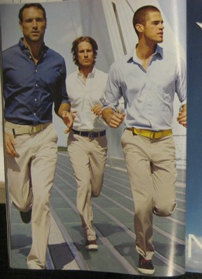 For those who like to work out wearing business casual attire, Nautica has the thing for you. The “True Khaki.” As you can see by the photo of these guys running across sundial bridge, Khaki is very versatile workout attire. I bet Santiago Calatrava himself wears Nautica khakis for jogging. Who wouldn’t want to forgo the lightweight nylon and elastic, for some sweat soaked cotton held up by a D-ring webbing belt. Let’s not forget the unmatched comfort given by the addition of a wrinkle-free, slim fit, stretch cotton, button up (with the top 2 buttons open and sleeves rolled up, of course). Finally, get rid of those hoity toity “running shoes” and replace them with a pair of topsiders or converse skid grips. Now you are ready to do some real running.