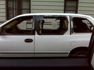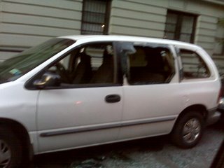 When I was moving the car this morning, I saw this. I apologize for the blurry photos, I took them as I was driving past, with the crappy camera on my phone. I hope that I never have to wake up and find my car in this condition. I also hope that I never own a white mini-van with fake chrome hubcaps.