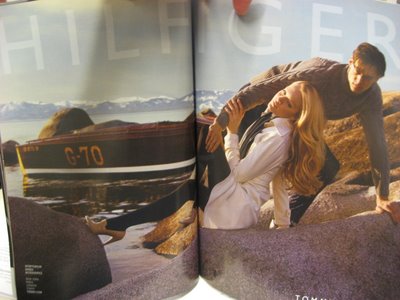 Alright, as with the Guess and Nautica ads, I actually think that the clothing in this particular ad is swanky. I also covet the G-70. It appears to be a finely crafted vessel. This shot though, comes off so awkwardly. What is going on in this picture? They get all dressed up for a boat ride through the fjords in the trusty ol’ G-70. He throws on his mock turtleneck, she: the white pea coat and stilettos. They pull up to a rocky bank and decide to lounge for a bit. As they gaze down the shore line, they become entranced by the spectacle of a mother seal eating her young. He is fascinated, but overcome by moral instincts. He mutters “c’mon baby, lets go” and gets up to leave. She, with eyes still fixed on the carnage, whispers “Not yet. Not… yet.”
