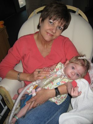 Piper has been spoiled lately with all kinds of visits from cousins, aunts uncles and grandparents. Last weekend, Piper grandma Baker came to visit her. Apparently she had been saving up some tricks specifically for this occasion. It was the first time that we had ever seen Piper completely flip herself over onto her stomach. It almost seems like she would start to crawl, if she wasn’t all tangled in her tubes and stuff. It was so funny to watch her do it though. In fact Saturday, when we arrived at the hospital, Piper had already positioned herself on her belly and was just wiggling around, and goofing off. It was so funny. I have to admit though, when she is on your lap and tries to do it, it isn’t as funny. She is so strong now, that you really have to be on your toes, so that she doesn’t flip off right onto the floor. It was nice for grandma Baker to see her doing so well, since the last time she was able to visit, Piper wasn’t doing so hot.