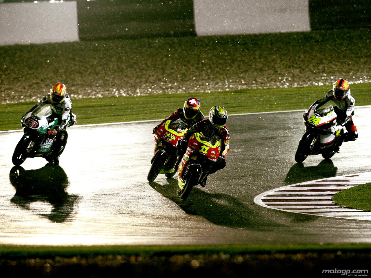 I sat down Sunday night and turned on the TV, totally pumped to watch the 2009 MotoGP season opener, and noticed it was last year’s race showing on the screen. I was really confused until a banner started scrolling across the bottom of the screen, saying that race had been rained out and postponed until Today. The rain didn’t stop the 125 or 250 class from racing. The photo above is from the 125cc race. Notice how they aren’t getting low in the corners, at all. From what I understand, neither of those races went the full distance, and one of them stopped after only 4 laps. It was kind of a let down. But hopefully it will be a good race today, and I will be able to see it tomorrow.