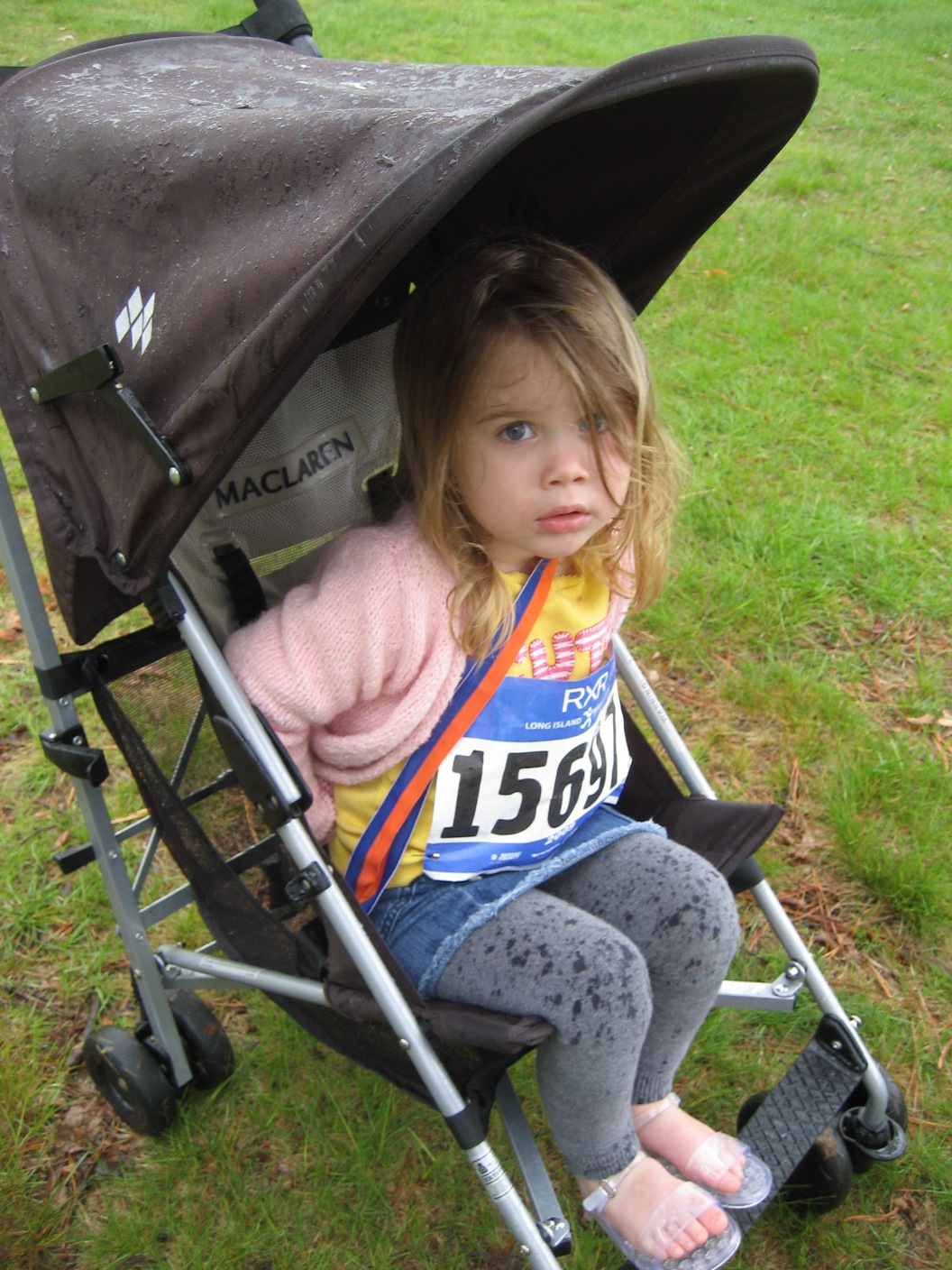 On the upside, Reagan ran the half marathon and had a great race. She got a respectable time and had a lot of fun. She was able to finish before the downpour really kicked it. Our friends the Carters came out to watch us finish, which was really cool, especially considering the less than optimal weather. Afterward we had pizza at Grimaldis together. Their two little girls were really good sports about hanging out in the rain for so long. Reagan shared her bib and medal with Adeline. I wonder if they have a stroller division for these races.