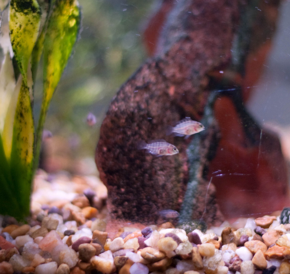 These little guys have been doing great. They are eating twice a day, now. I moved the mama back to the large tank, so she could be back with her homies, and resist the urge to cannibalize any of her young. This week some of them have started to develop their little convict stripes.