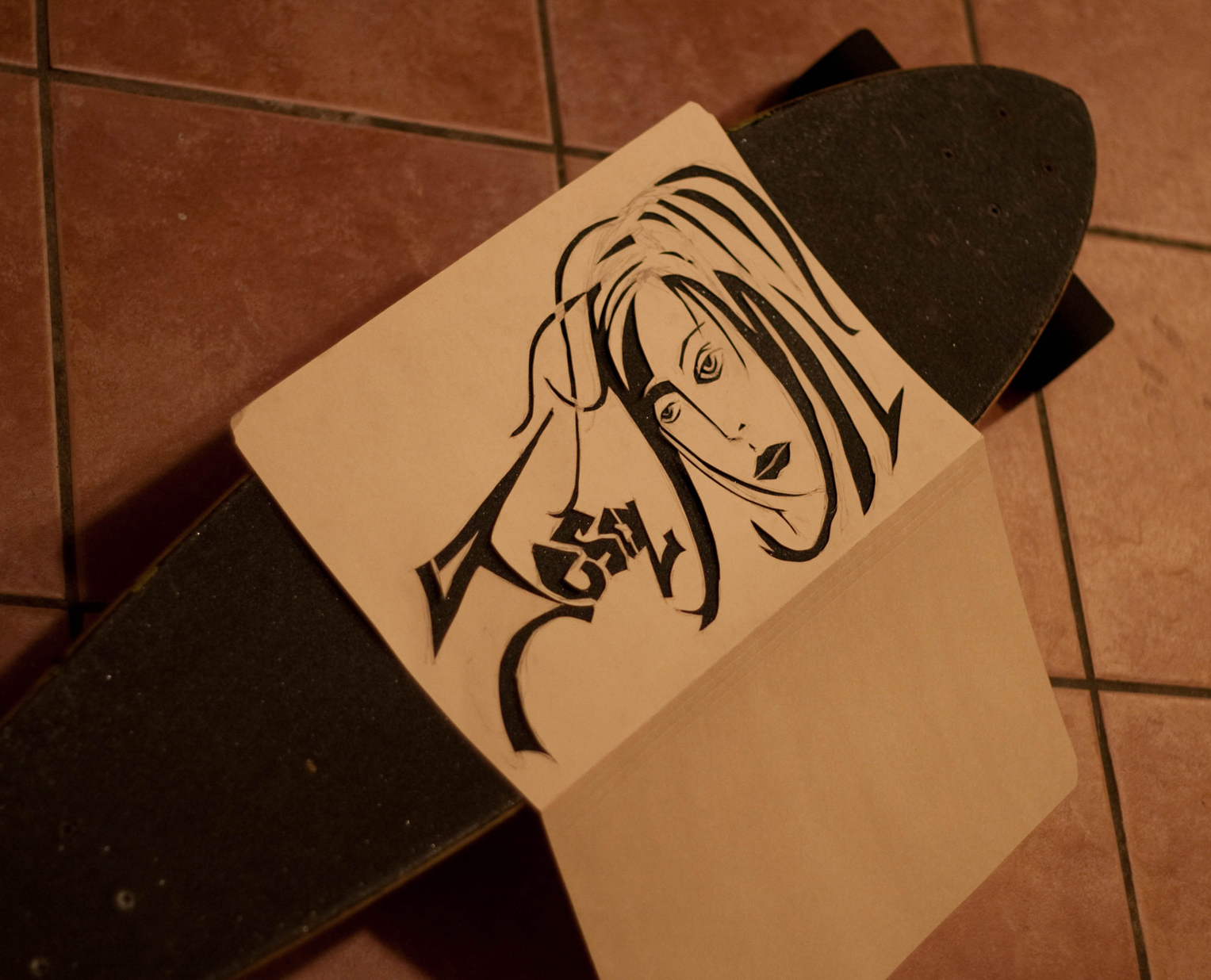 Sunday night, Reagan was being all artsy, working on some stuff for Piper’s birthday. She was having so much fun cutting up paper and stuff, that I decided to get in on the action. I got this great idea to draw and cut a stencil for the grip tape on my longboard. So I pulled out the pencil and x-acto knife and went to work. This is what I came up with.