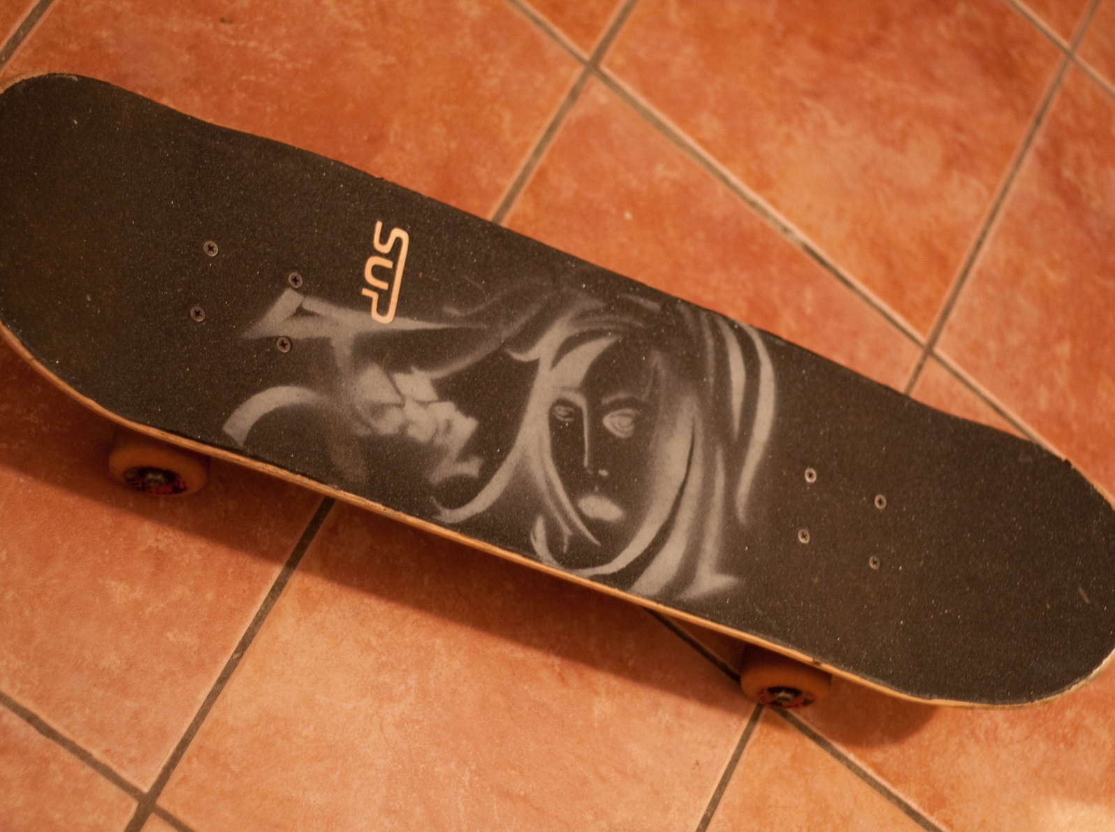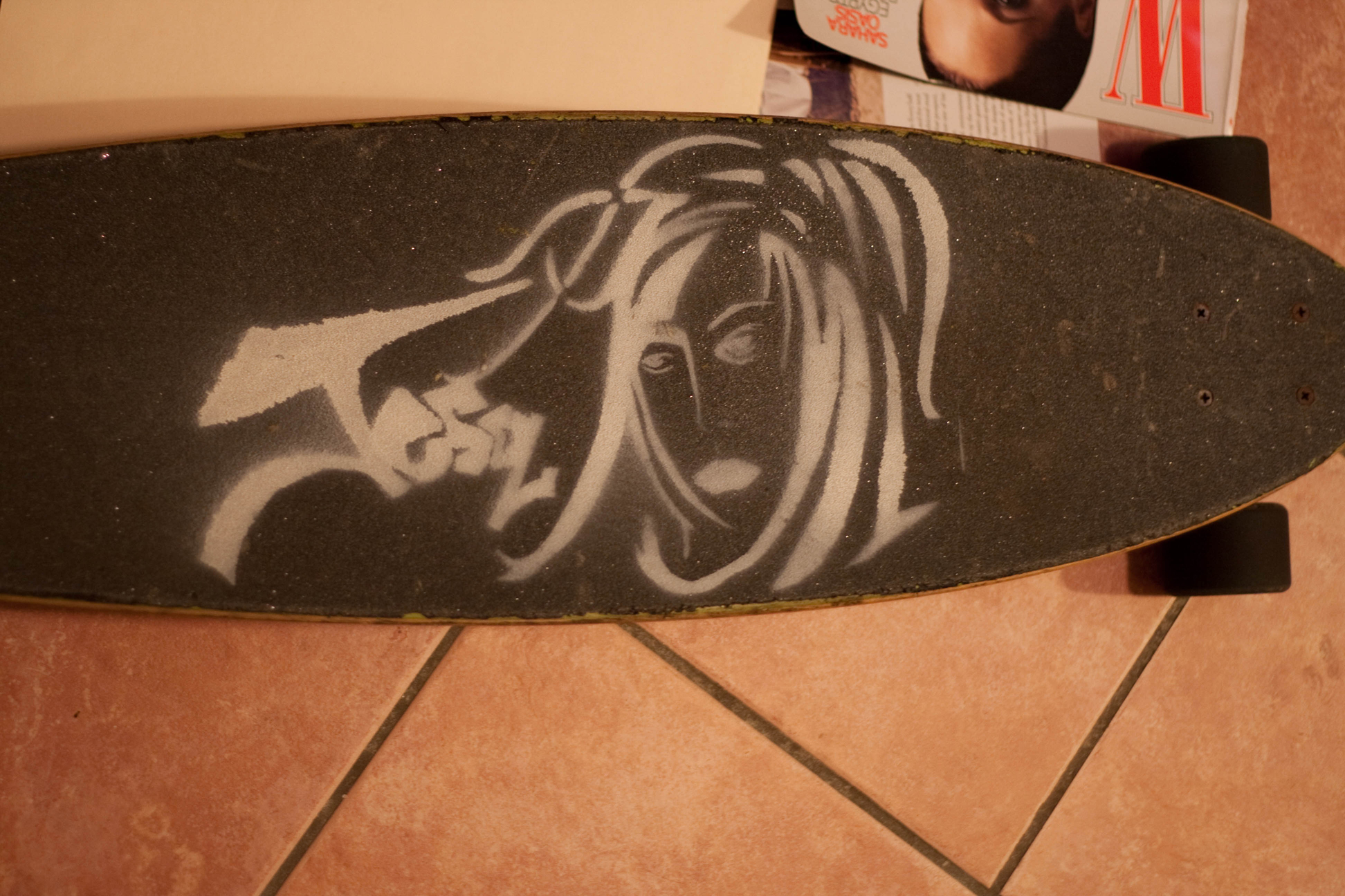 It didn’t come out exactly how I wanted it to on the longboard, so I painted one of my freestyle skates, also. I found that it was tough to get the stencil to lie correctly because of the concave in the deck. Oh well. I don’t feel like it was time wasted.