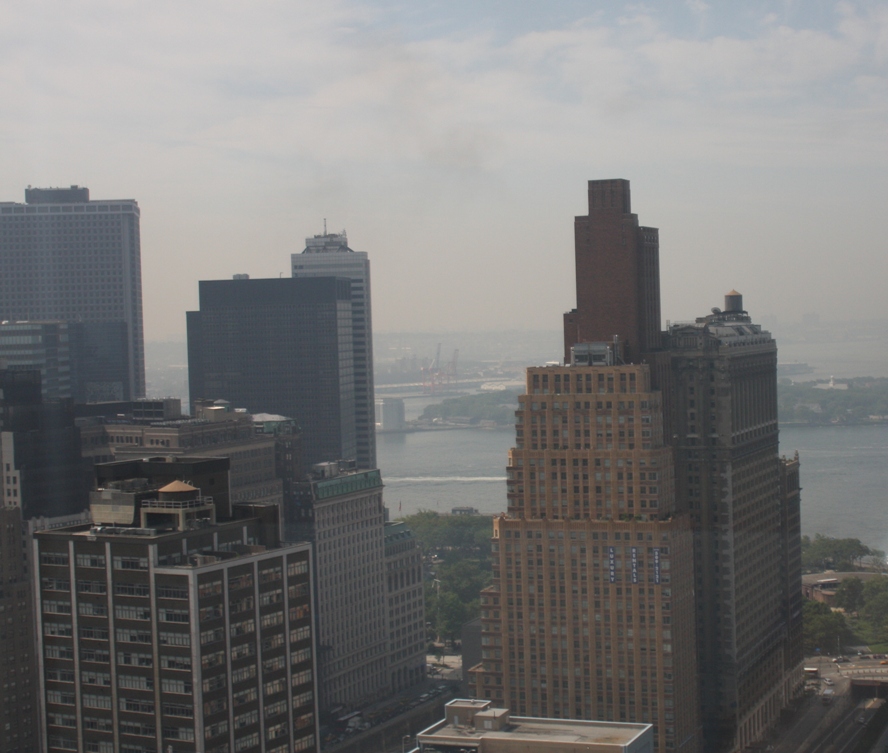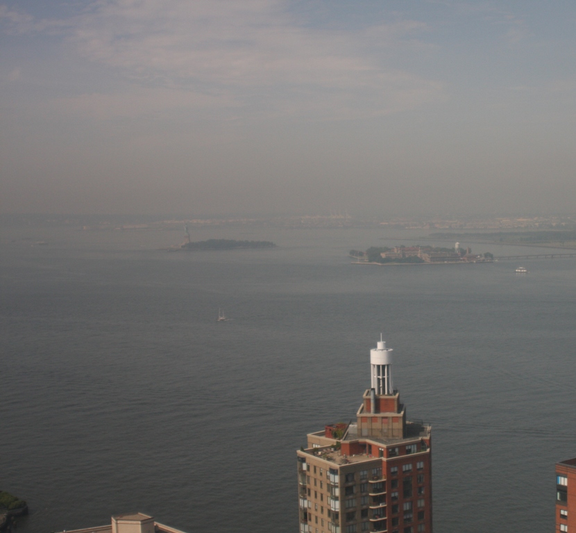 Yesterday, New York City finally decided to slip out of the extremely pleasant and mild mid-80’s, low humidity, straight into the dog days. I went for a very short run last night (14 minutes long) solely for the purpose of calibrating my new sportband, when I got home from work. It literally took me over an hour to stop sweating, afterward. So gross. This morning, we have so much ground level ozone, that it almost looked like fog, earlier. Here are a couple of shots across the harbor, that I just barely took. There is so much water in the air, that you can practically swim.