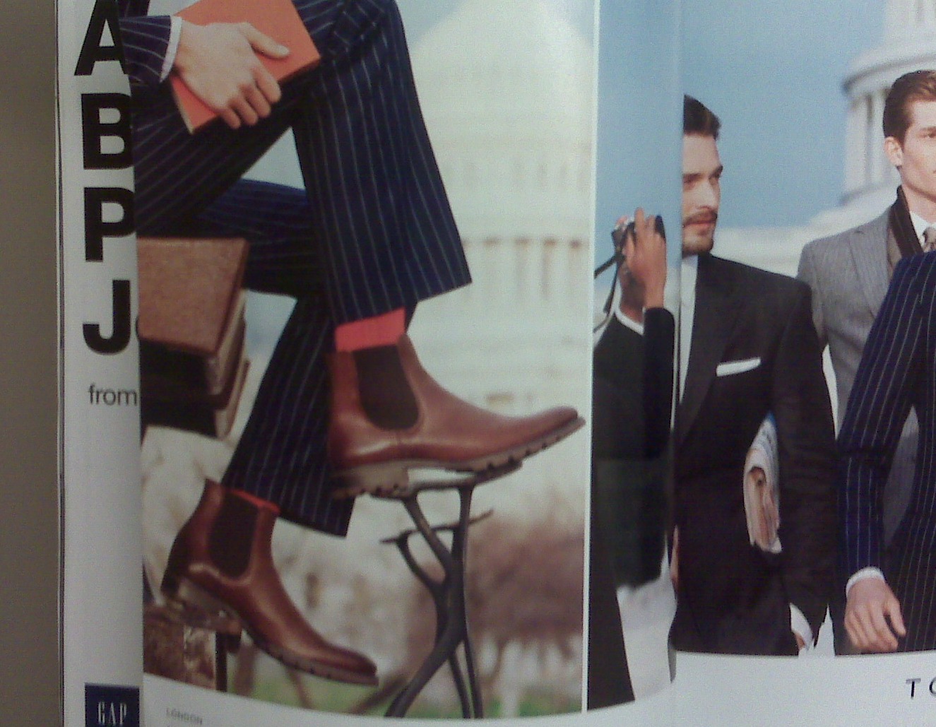 I really enjoyed this multi-page Tommy Hilfiger ad. It depicts some young guys (maybe interns or pages) wandering around Capitol Hill in suits. Not bad. But then upon turning the page, it shows the footwear. Elastic-side 3/4 high boots. From any perspective, I’m pretty sure that consensus would be that these boots are dubiously appropriate for a business formal ensemble. But for me personally, the idea is even more entertaining.