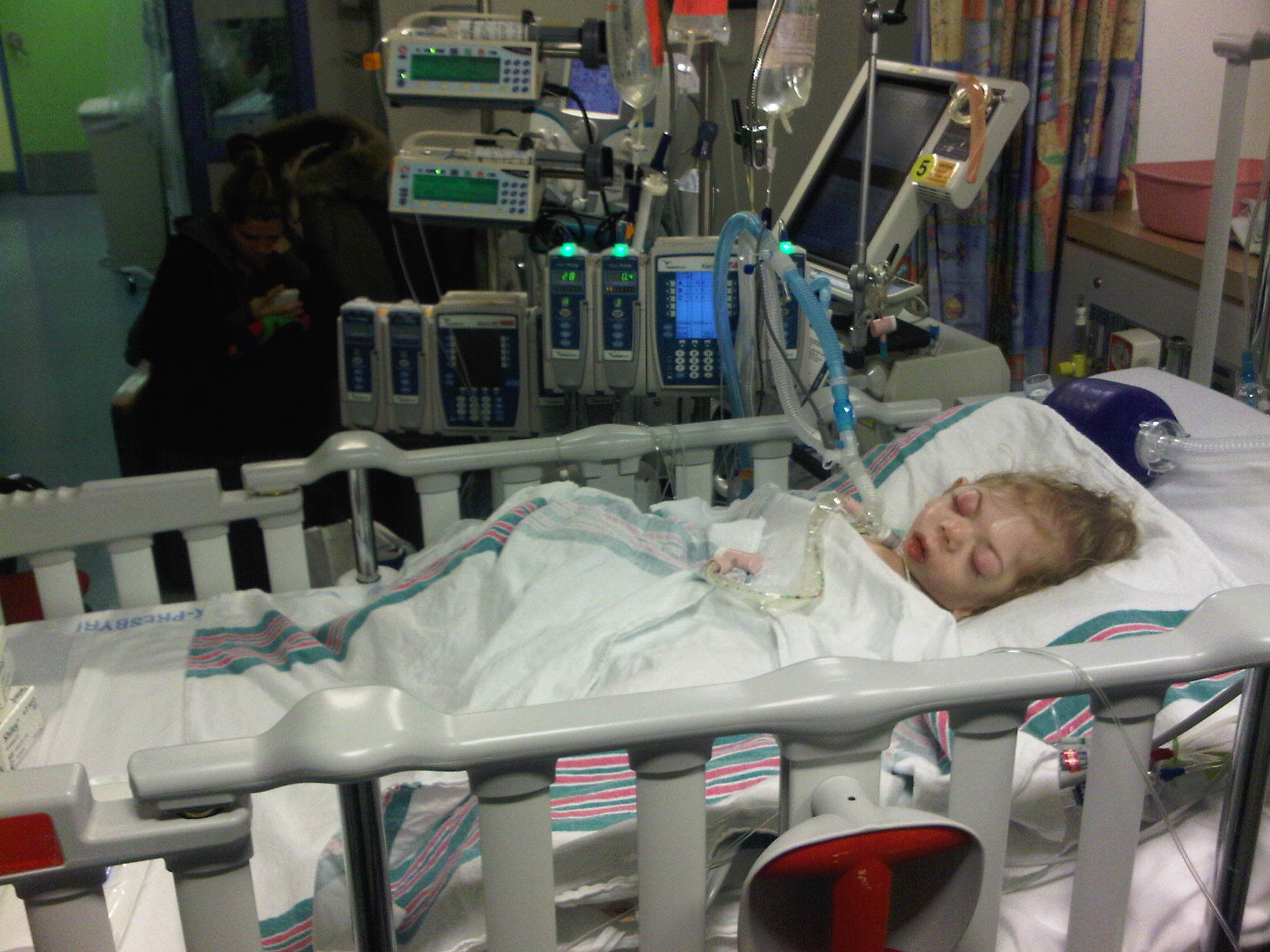 ^—-PJ all swollen up from her IVs, safe and sound back in NYC