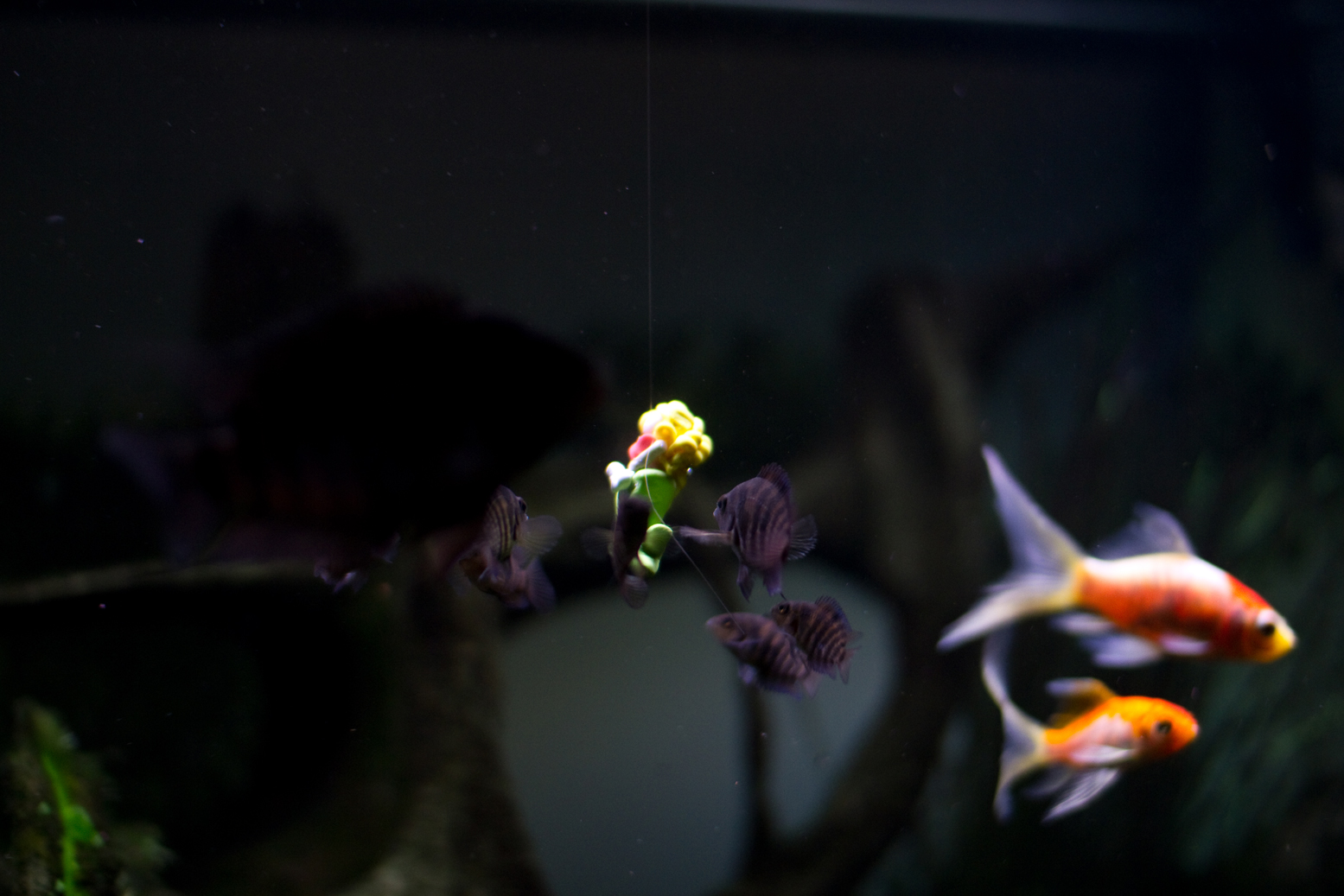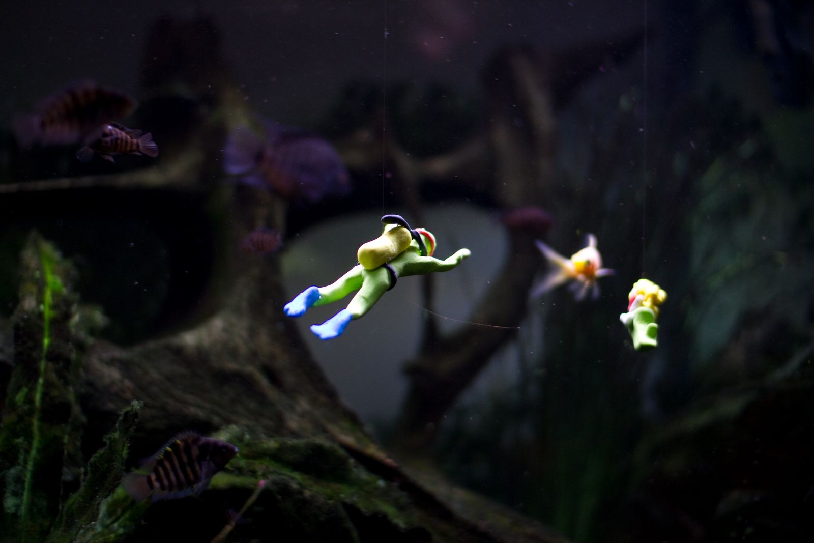 By the time that we finished building all of the little guys, and baking them in the oven, we were kind of running out of energy to get really fancy with the photos. But, we did have a lot of fun with the underwater scenario (shot in the fish tank). Reagan suspended a little scuba diver and mermaid from some of her hair. Yes, she tied one of her hairs around them (her idea [an awesome one]). Hahahaha. The baby convicts and the gold fish were the funniest part about it. They were so incredibly curious about what was going on, that they are in just about every shot. Look how curious the little convicts are in the shot below, when Reagan first dropped in the mermaid.