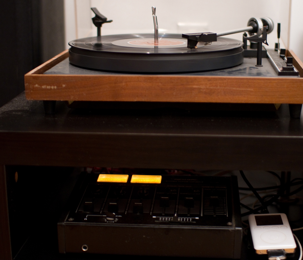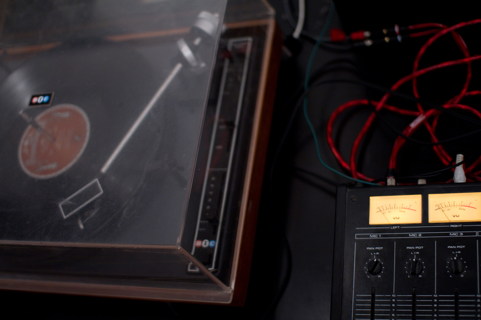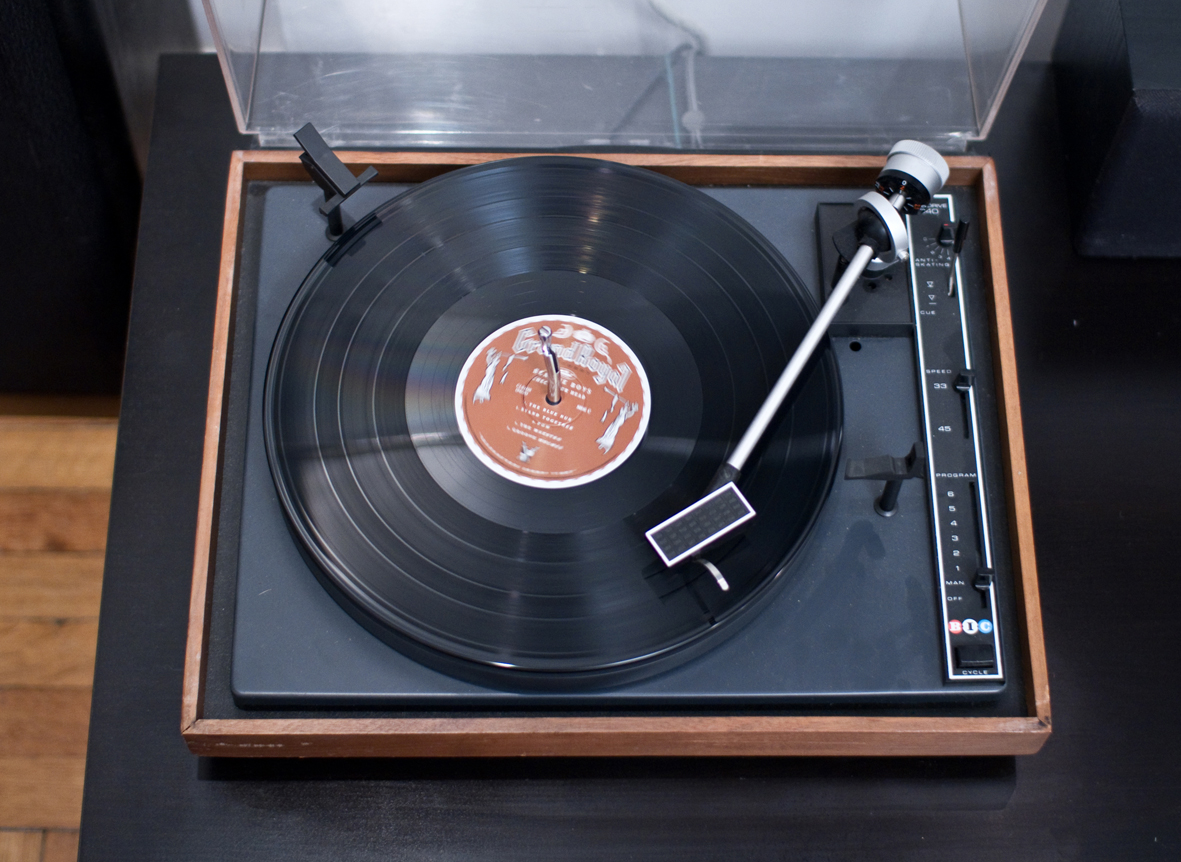 I tried just rigging it anyway, but it was barely audible. Thankfully, I had an old mixer from a former life, when I aspired to having DJ skills, complete with ground terminals for magnetic cartridge turntables (and analog pre-amp level meters). I’m sure that Reagan was a little bit nervous at first, with all of the cables snaking everywhere. But eventually I was able to get it all arranged and normal looking. Also, it sounds fabulous. Thanks for the LP, Reag. Thanks for the turntable, random WaHi resident.