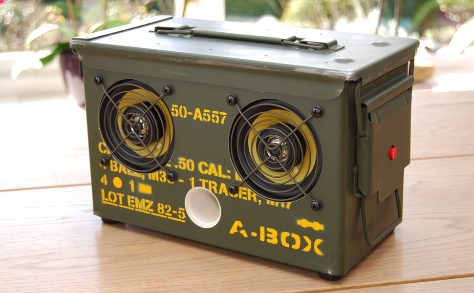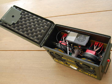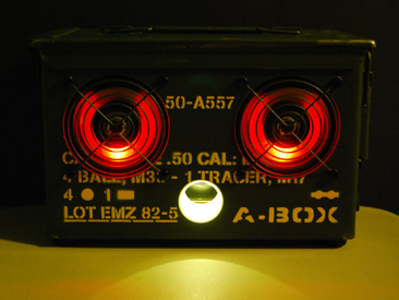 Ultimate iPod deck, built from a 50 caliber ammo-can. The only thing that even gives this thing a run for its money, is coconut headphones. There are two versions. One comes with dual 25 watt amps, the other with dual 70 watt amps. Holy cow! 70 watts x2 is more juice than some very loud guitar amps that I have owned. They run about 250 quid (over $300). I’m half tempted to make a summer project out of it, and build one of these.