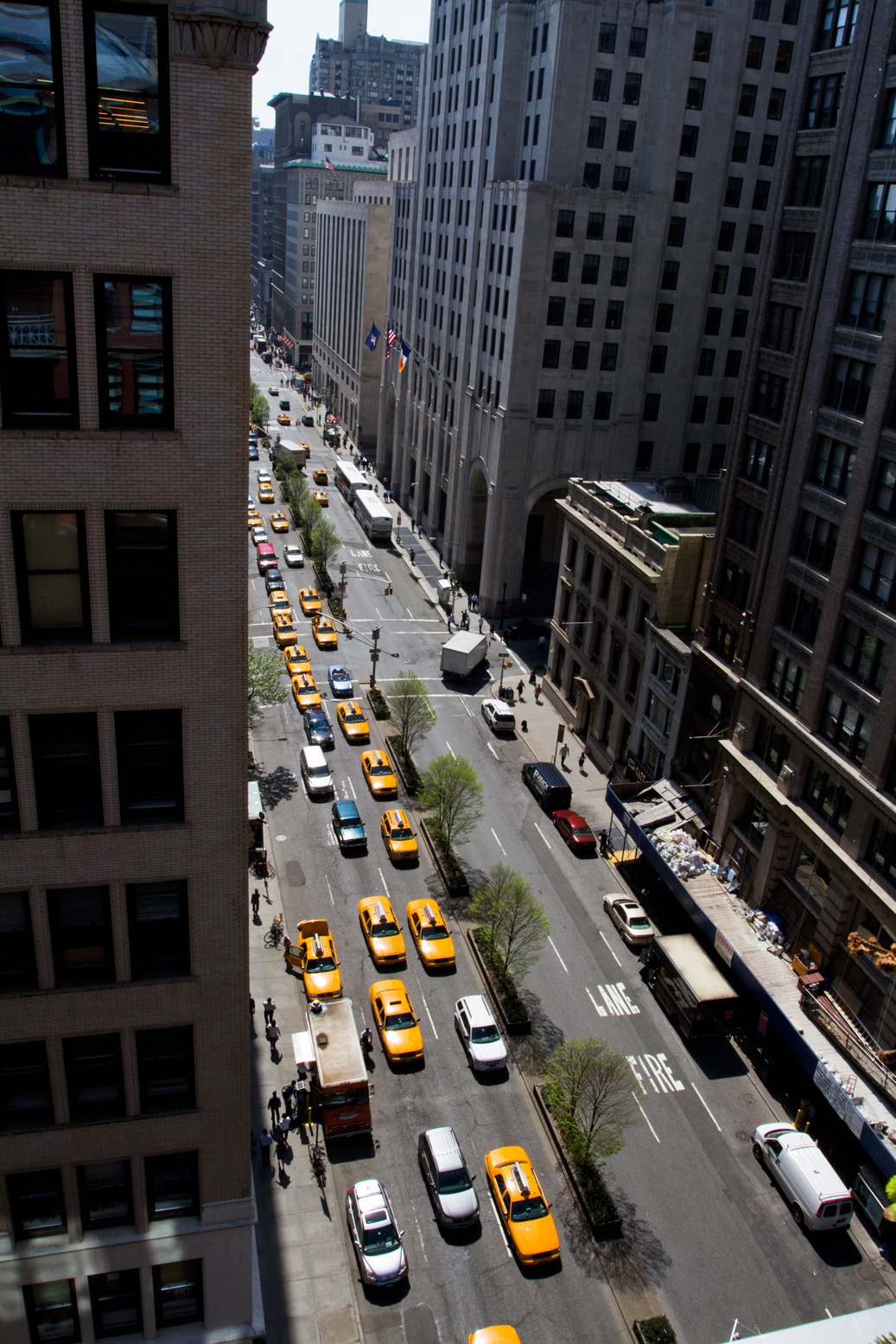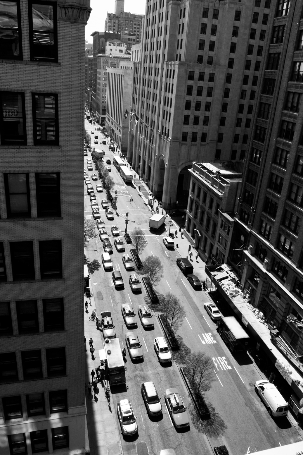 I was on Park Avenue today shooting a lookbook preview for SoJones. I arrived a little bit early, and they were giving a tour to some group from FIT. So I wandered out on the balcony and grabbed a quick shot of Park Avenue S. (below) It is hard to tell in the bw version, but there are little leaf buds on those trees (here is the color version, if you are interested).