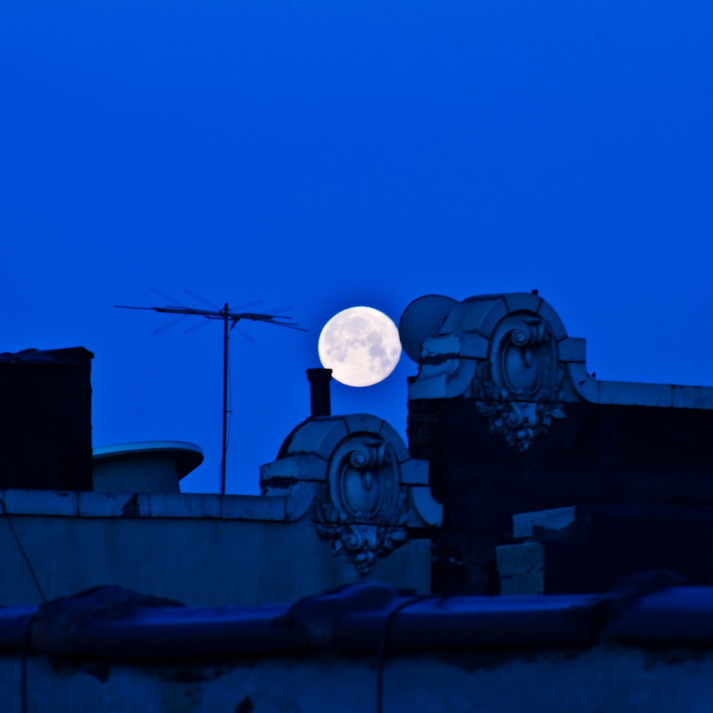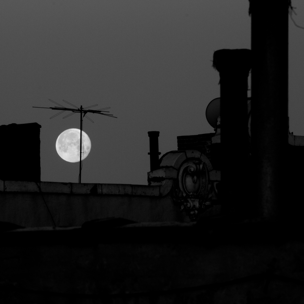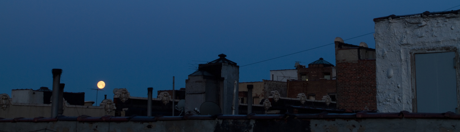 I was thinking it would be fun to get some full moon shots, last night when I was watching it rise through the window. Not much later, I saw a shot on Gothamist that was taken at 5:45 in the morning, that looked pretty cool. It made me want to copycat, and shoot one in the morning, also. So I woke up at 5:30 (since it is laundry day, anyway), grabbed the tripod and gear bag, and headed up on the roof. No sooner did I get up there and set up, than I realized I had left the 200mm lens down stairs. Dreading the trip back down the ladder, I snapped a couple at 40mm. I soon realized that they were all going to turn out like crap, w/o the 200mm. So I hurried down the ladder, grabbed the lens and climbed back up, just in time to get it mounted and get the shots below.