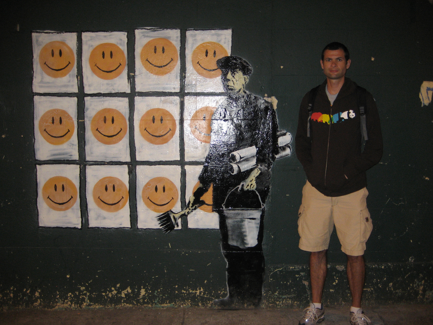 The title of this post sounds like a children’ s movie about a pet who dies. I didn’t have a pet who died (recently). But I have to say that I’m pretty bummed out that all of the pieces (that I know of) that Banksy left around the city this weekend, have been defaced, if not completely destroyed. I’m so glad that I was able to see them in person before they were messed with. I shot all of them for Highsnobiety early Monday and had someone (in most cases, a passer by) snap one of me next to the art, with the point and shoot cam.
