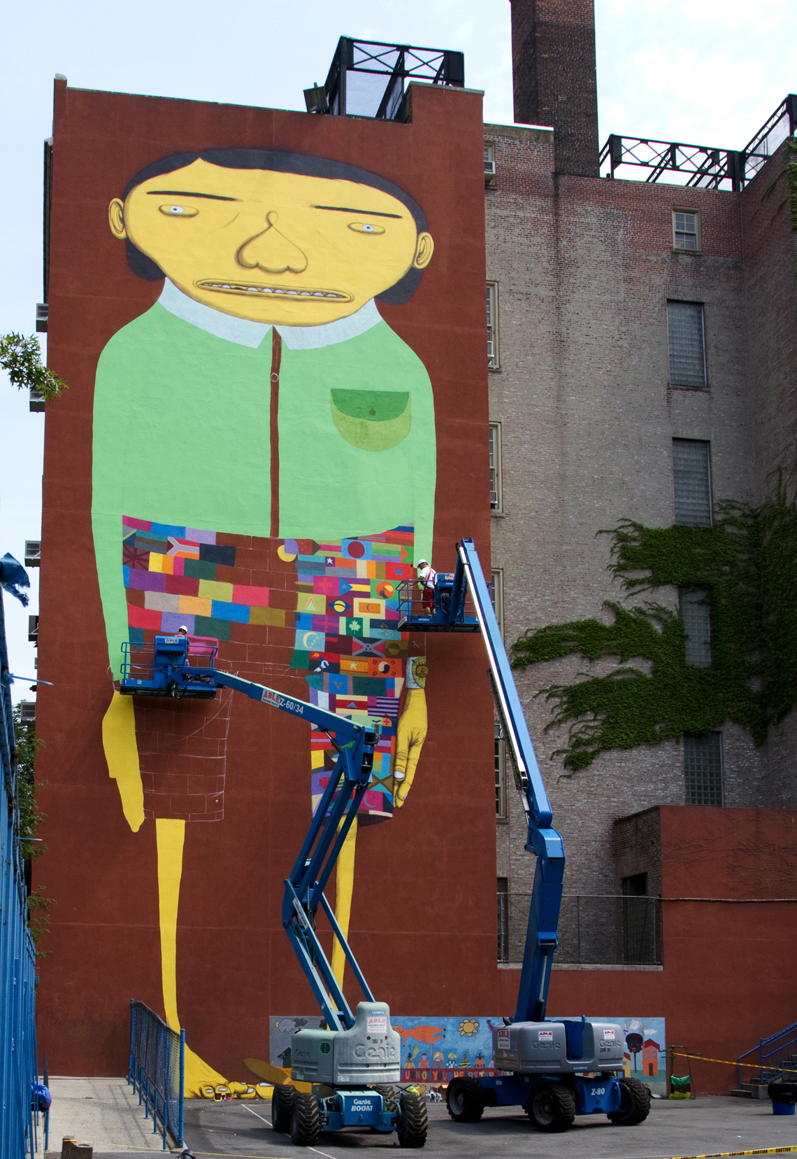 After pulling out several hands full of hair (my own, hehe), and consulting with some of the most knowledgeable programmers I know (maximum thanks going out to Andre and Jansen), I was finally able to get the php garbage all resolved and running correctly. As a double bonus, I was able to eliminate all of the malicious scripts from the MySQL db’s. To top it off, I woke up today feeling quite a bit better. I’m going to hold off with running until Wed., just to play it safe. Things are looking up. Speaking of looking up, check out the image above, of the latest work by Os Gemeos (my favorite Brazilian street art duo), going up in Chelsea. I shot it Monday afternoon. It looks like they will probably be finished with it in another day or two.
