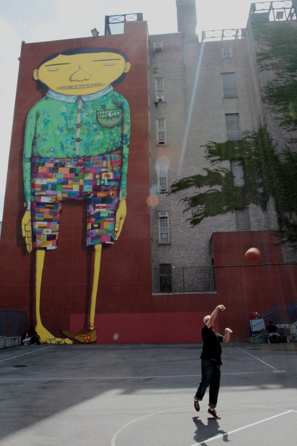 I dropped by PS11, again today, for Highsnob and had another great chat with my favorite Brazilian artists. Below is a shot of the finished piece, with Otavio shooting hoops in the foreground.