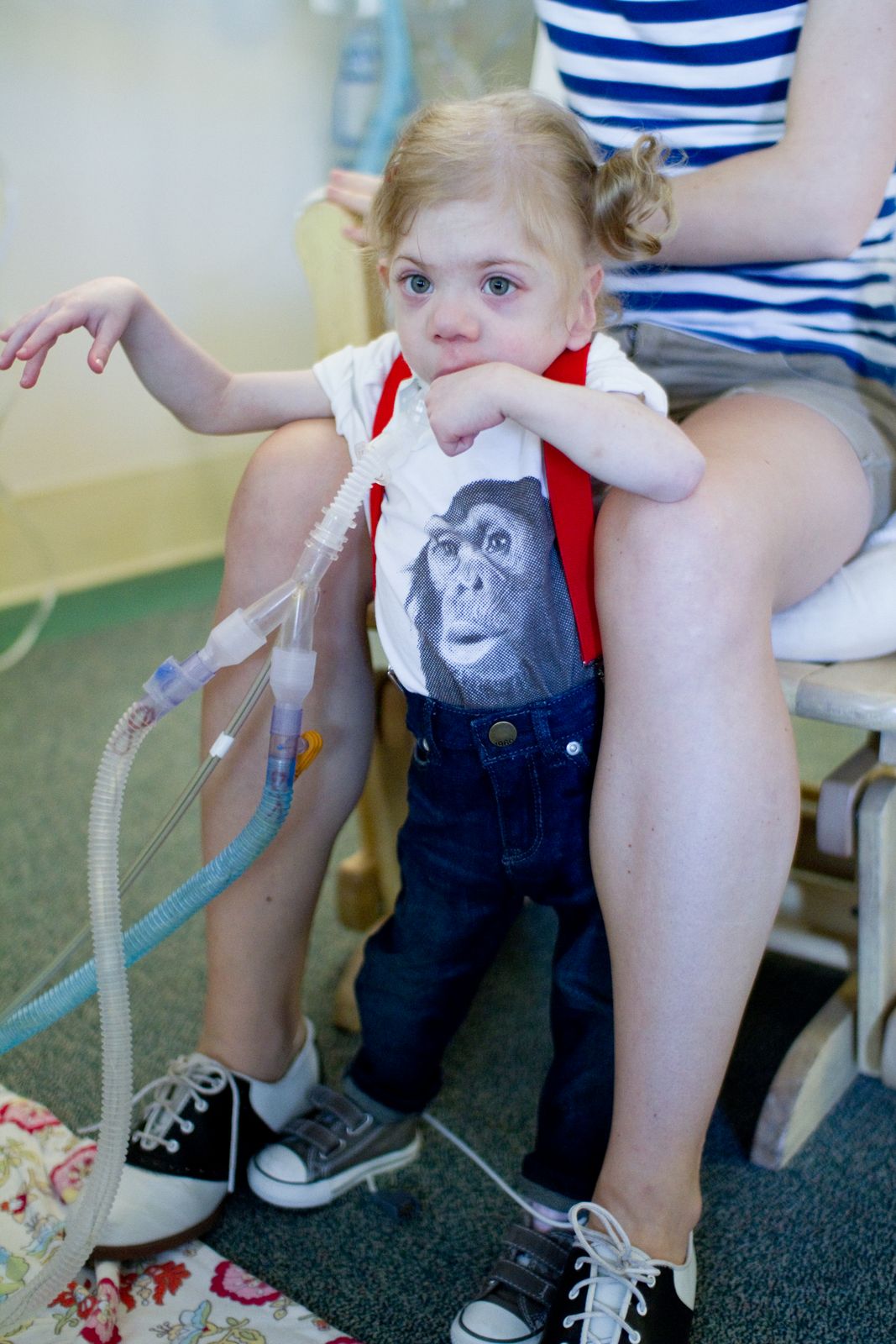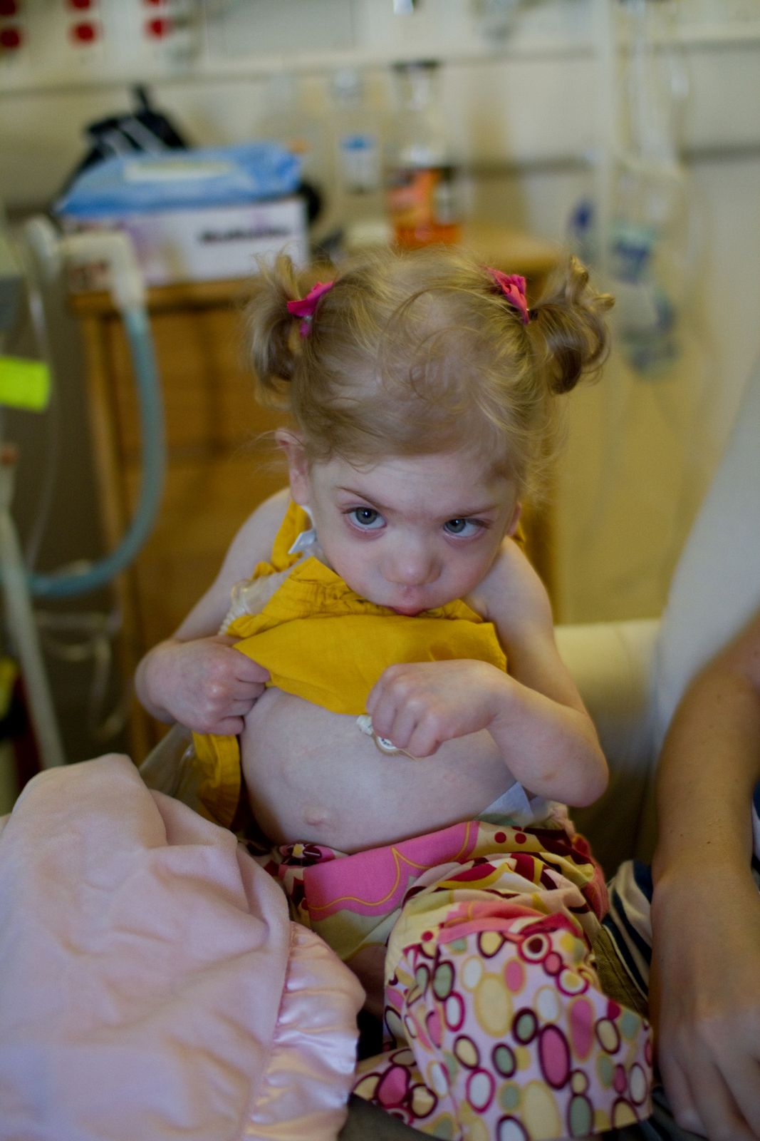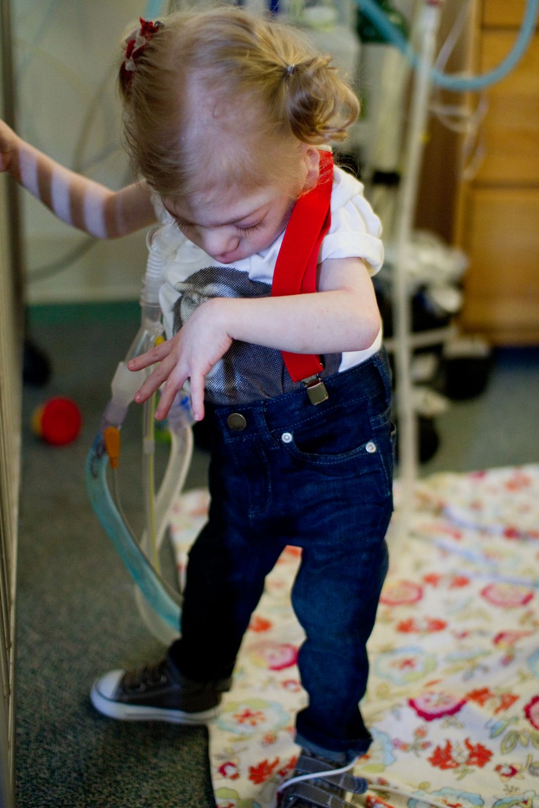 First of all, the funniest thing ever: When we arrived Saturday afternoon, Piper was just waking up from her nap. She was kind of playing with the little device where her G-tube (feeding tube) connects to her belly. We didn’t think much of it, at first. But after changing her diaper, clothes, she was still obsessed. She kept pulling up her shirt, to tap on it, and play with it. Hahahaha. Below is a shot of Piper in her new skinny jeans, tapping her G-tube through her shirt.