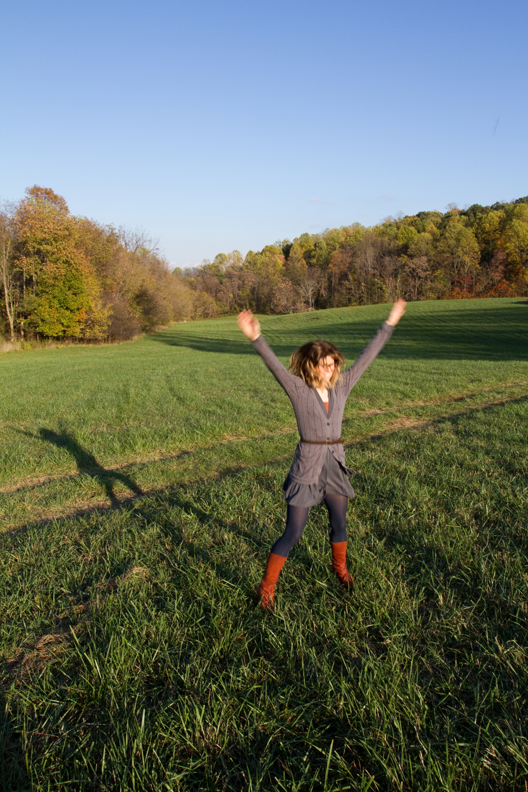 We only stopped a few times, other than to fill up. Somewhere in VA, I found a large field for Reagan to get out and stretch her legs. So, naturally, she did some jumping jacks. This was the only time along the way that we really broke out the camera.