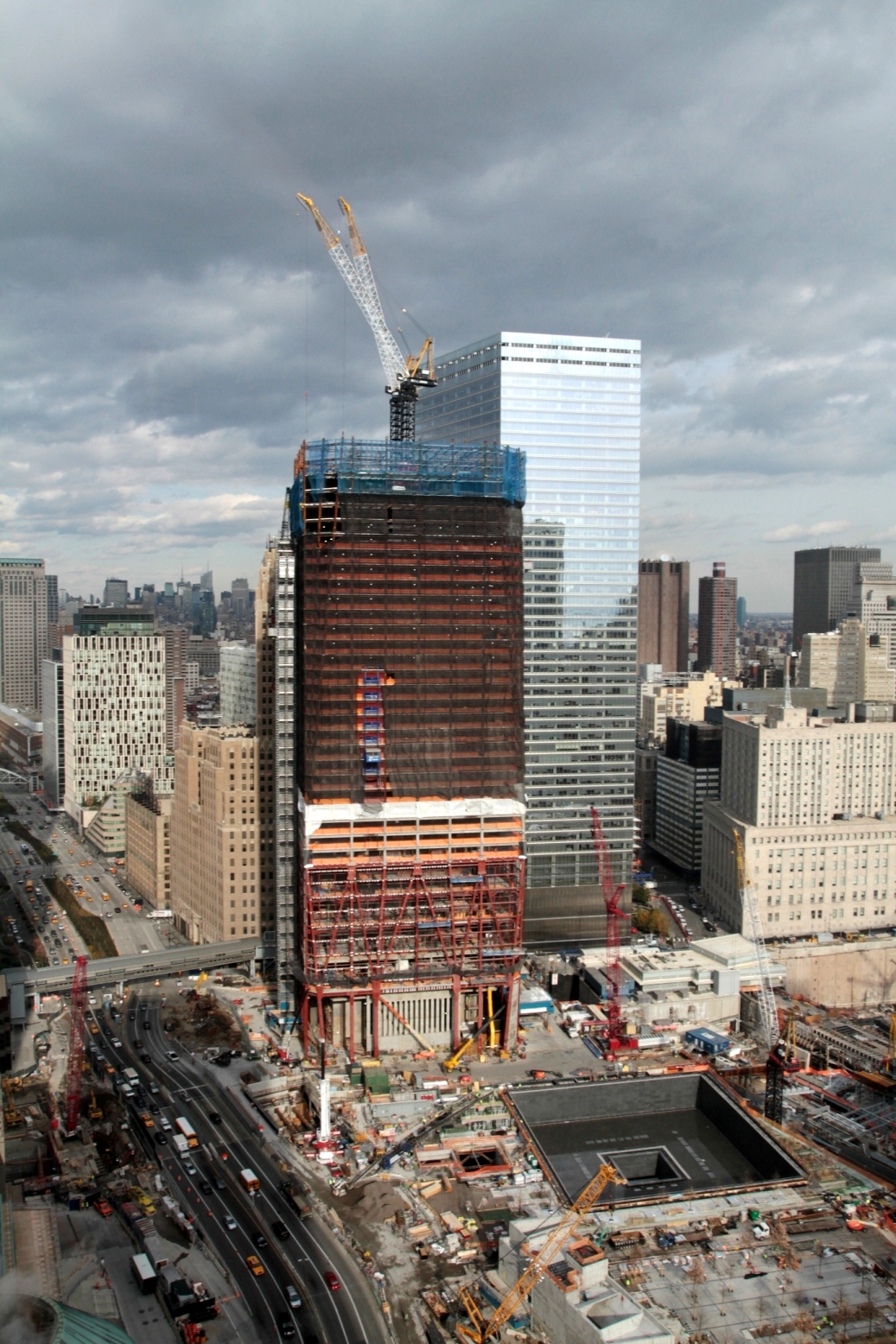 A couple of weeks ago, I was doing some work on the north end of our building and noticed that 1 WTC  is now as tall (or taller) than where I sit. I managed to write a quick blurb about that observation on FB. My friend Jon read it and asked me to take a photo. So, Jon, here is your photo. It isn’t the sharpest image, because unfortunately, I’m shooting through dirty glass. But you can definitely get an idea. You can see that they are also making progress with the reflection pools. The one closest to the tower actually has water in it. Gothamist ran an article about it the other day.