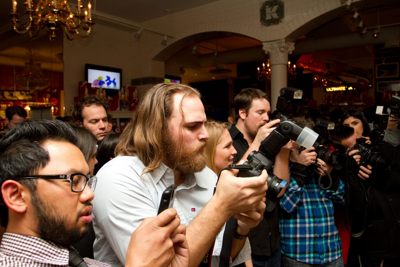 Ok, first of all– feel free to count the number of beards that appear in this post. Second of all– we had a blast last night. There were a lot of cool people who showed up to the party at Kiehl’s. Reagan was chatting it up with Dexter, before I snapped the image above. She was interviewing him for her hair blog. The shot below is of my homey Zach, in action. Zach is the guy in the middle of the frame wielding the 5D. It was the first time that our beards had ever met. They seemed to hit it off nicely.