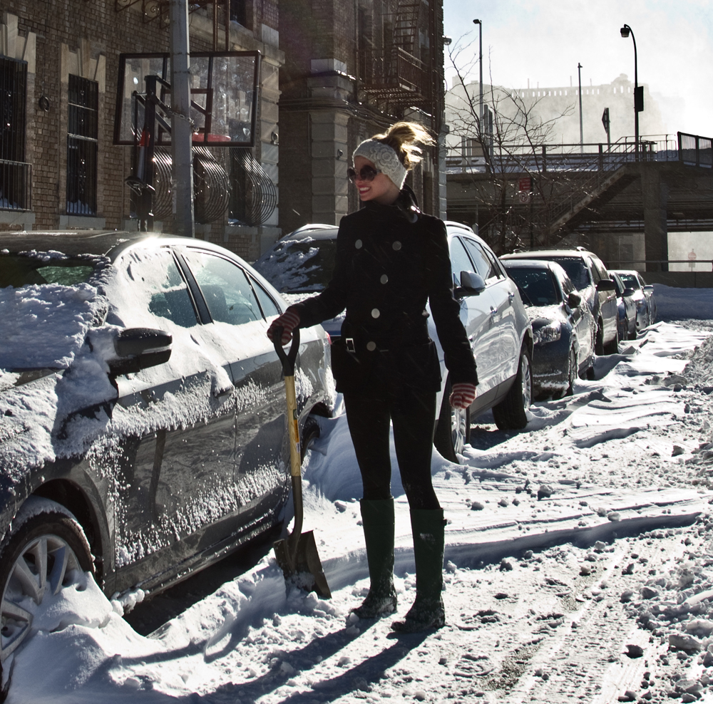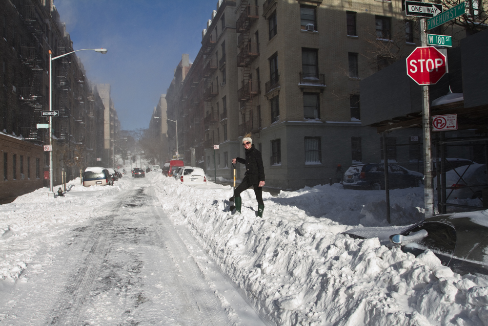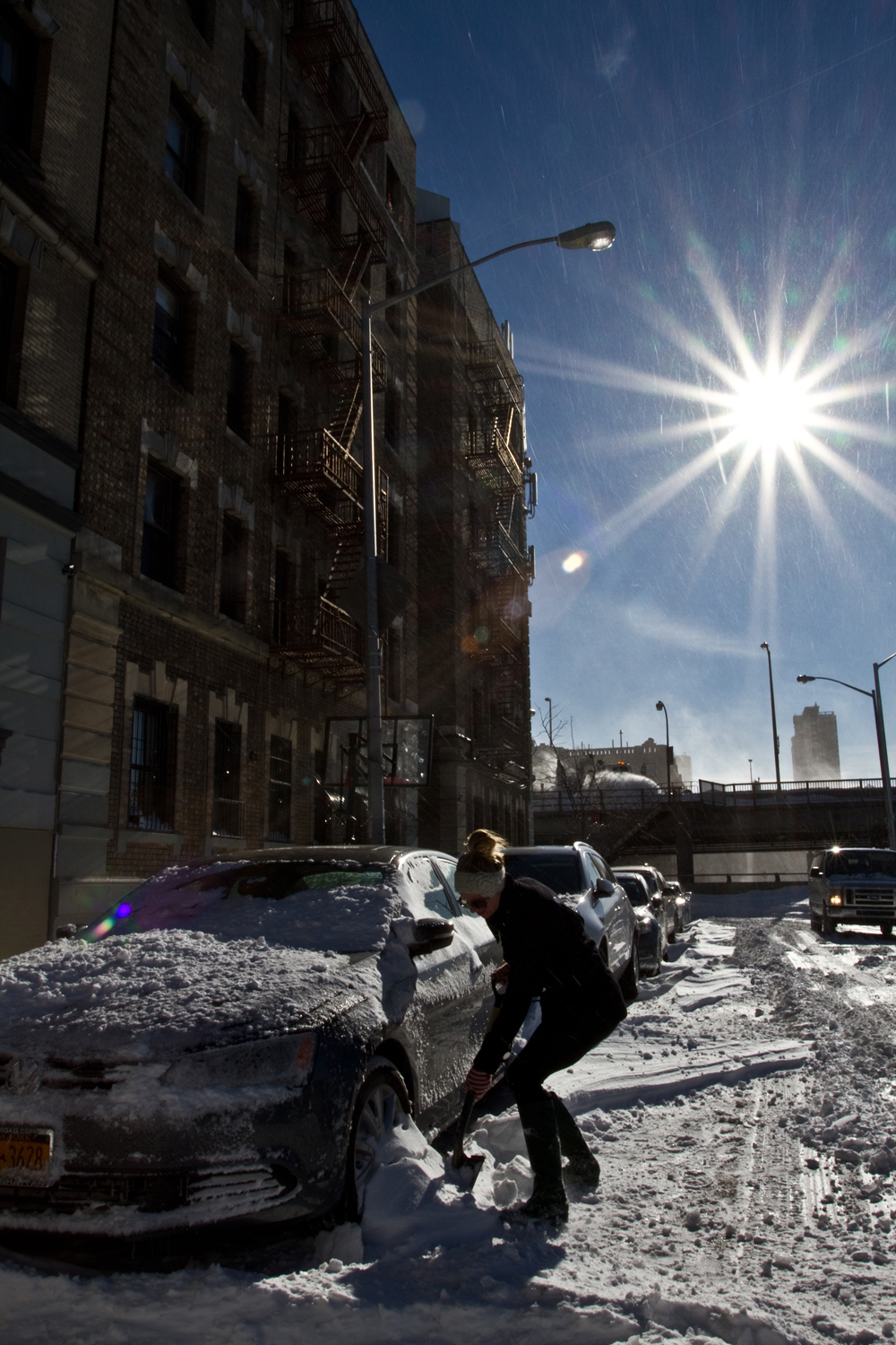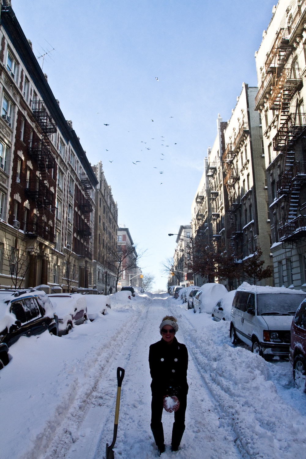 Yes, the rumors are true. NYC actually really did get a legitimate snow storm. I used to snicker to myself when they would shut down the schools here because of snow. Growing up in SLC, I recall nary a time when schools were closed because of snow. I haven’t done any side by side statistical comparisons, but from my own observations, it snows in SLC with much greater frequency and quantity than in Downstate NY. But I’m here to tell you that yesterday/last night, we really did get a storm. Apparently they measured 20 inches in Central Park (fun fact: snow removal costs the City approximately 1 million dollars per inch). As if that wasn’t enough. The wind has been strong all night and today. So there are places where it has drifted to depths of double over-head. You can see how much it is blowing in the photo above. Those streaks at the top of the frame are flying snow flakes (keep in mind this was with a 1/500″ shutter speed). Needless to say, there aren’t a lot of people going outside today, that don’t have to. Reagan’s salon was closed, and I am working from home. We took a break to go dig out our car. Luckily, we were parked on one of the more exposed streets. So, the wind had actually blown most of the accumulation further inland. Below is a shot of our block.